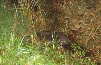 Dat er in de Hunze onlangs door gezamelijk optreden van het Gronings en Drents Lanschap bevers zijn uitgezet, wisten we wel. Maar dat een van deze prachtige beesten een kijkje in ons dorp kwam nemen, was voor ons een verrassing. Het voordeel van 's avonds nog even de hond uitlaten leverde deze confrontatie op: Op zijn gemak stak hij of zij de Dalweg over pal naast ons huis op nr 27 en schuifelde daarna de sloot in naast het huis van Pol. Ongeveer 80 cm groot ( en dat zonder de staart gerekend) niet te missen: een prachtbeest, die zich gewillig door de camera liet volgen. Op de haakse bocht bij de Oudelandsedijk lukte het hem niet door de duiker te gaan. dan maar de weg over. gelukkig is er op dit moment weinig verkeer, en hebben we hem in alle rust zijn weg naar de Hunze terug laten zoeken.wim en greet.